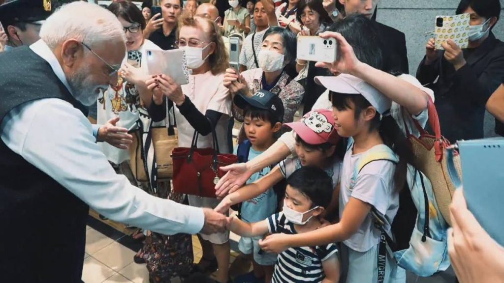 PM Modi warmly interacted with the crowd, especially children who lined up to extend their greetings. The visit was further marked by a symbolic gesture of friendship, as Japanese Prime Minister Shigeru Ishiba personally accompanied him on a Shinkansen bullet train journey from Tokyo to Sendai.